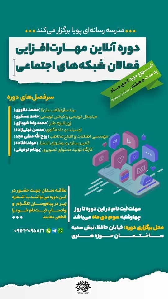 دوره آنلاین مهارتافزایی فعالان شبکههای مجازی از روز پنجشنبه ۴ دی ماه به مدت ۵ هفته برگزار میشود.