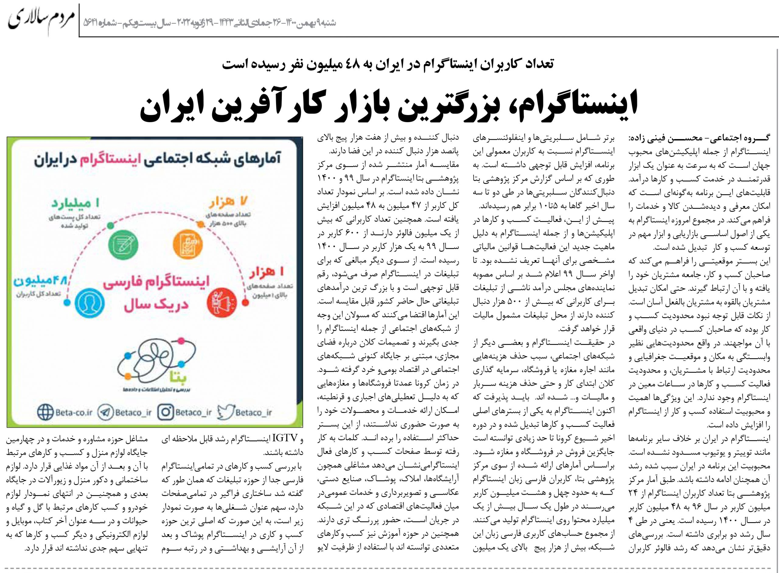 مقایسه آمار منتشر شده از سوی مرکز پژوهشی بتا اینستاگرام در سال 99 و 1400 نشان داده شده است. بر اساس نمودار تعداد کل کاربر از 47 میلیون به 48 میلیون افزایش یافته است. همچنین تعداد کاربرانی که بیش از یک میلیون فالوئر دارند از 600 کاربر در سال 99 به یک هزار کاربر در سال 1400 رسیده است.