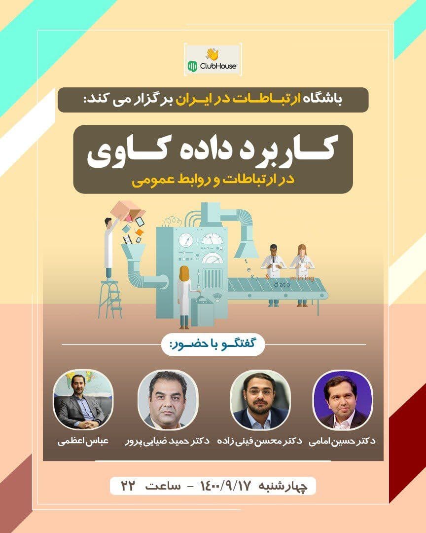پنل تخصصی «کاربرد هوش مصنوعی در داده کاوی برای روابط عمومی» در پانزدهمین همایش روابط عمومی الکترونیک این پنل تخصصی با حضور حمید ضیاییپرور (عضو کمیته علمی پانزدهمین همایش روابطعمومی الکترونیک)، محسن فینیزاده (مدیرعامل موسسه پژوهشی بتا)، حسین شمس (مدیرعامل نیوزهاب)، عطاءالله ابطحی (استاد دانشگاه آزاد علوم تحقیقات تهران) برگزار میشود. در پانزدهمین [...]